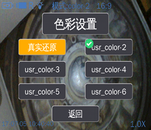 - Выбор цветовых режимов. Пользователь может выбрать один из шести встроенных режимов или настроить собственный. Цветокоррекция помогает улучшать читаемость изображения в зависимости от материала, освещенности и условий осмотра.